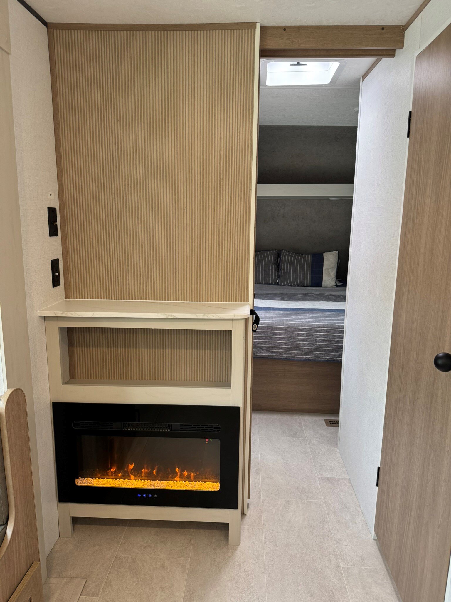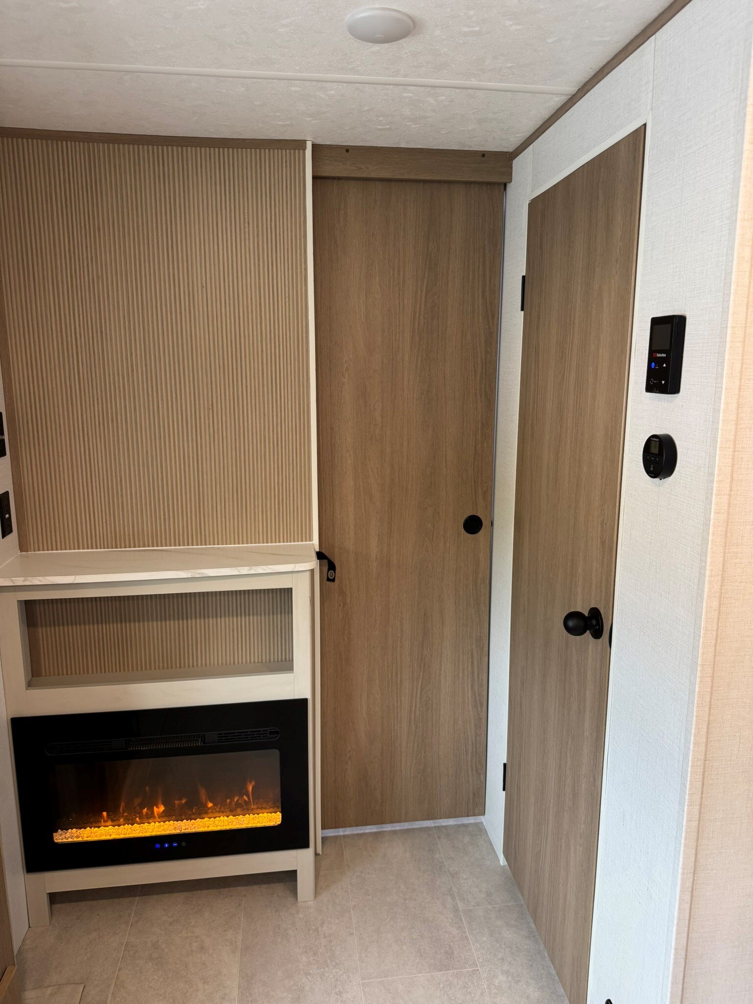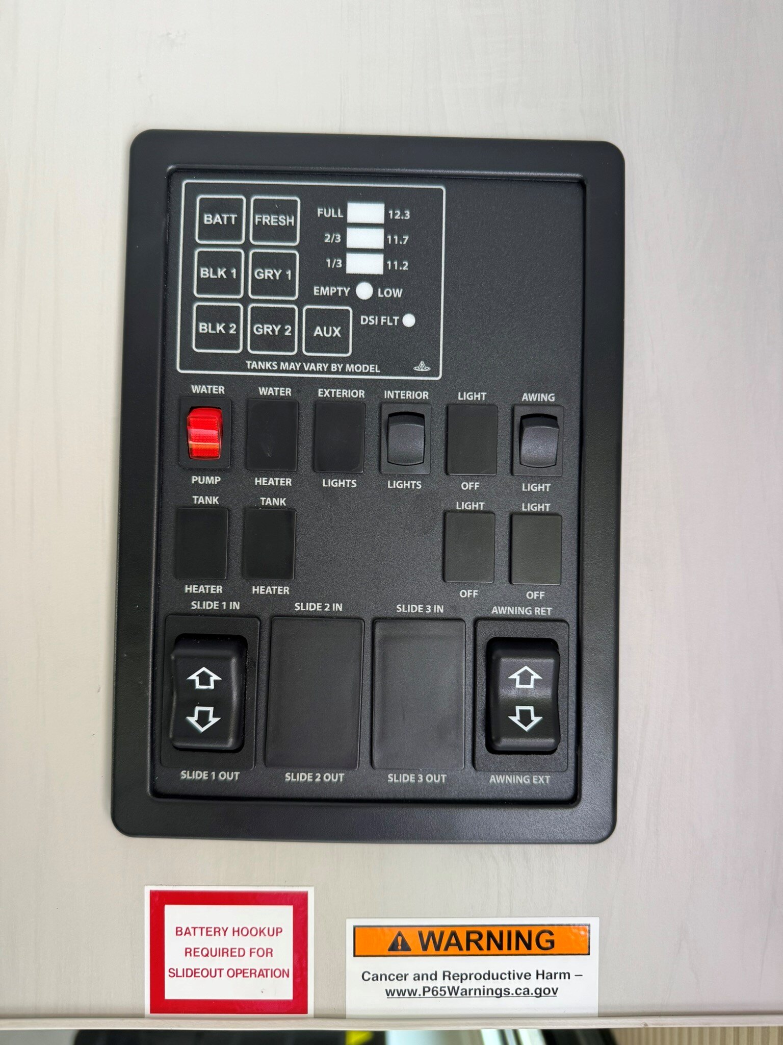 Dual entry doors, 1 slide with slide topper, Power front jack, power stabilizer jacks, hot water on demand, 2 propane tanks, furnace, fireplace, AC, power awning, led lights, 12V fridge, solar system installed and lots of storage!