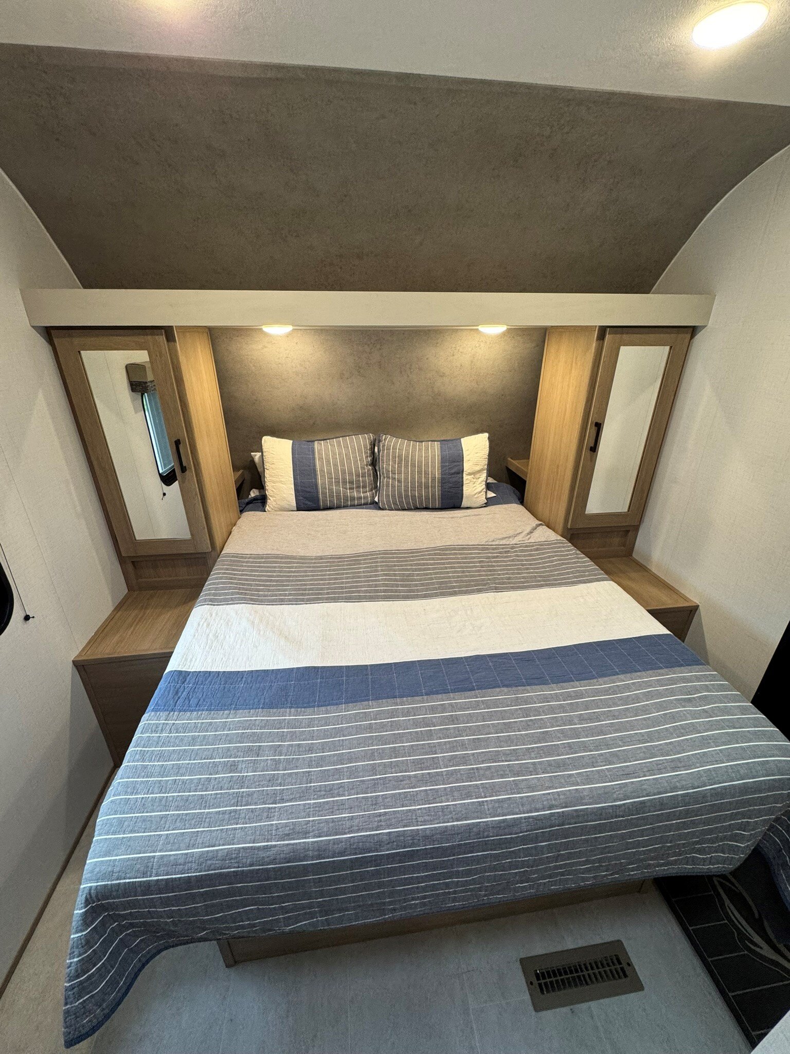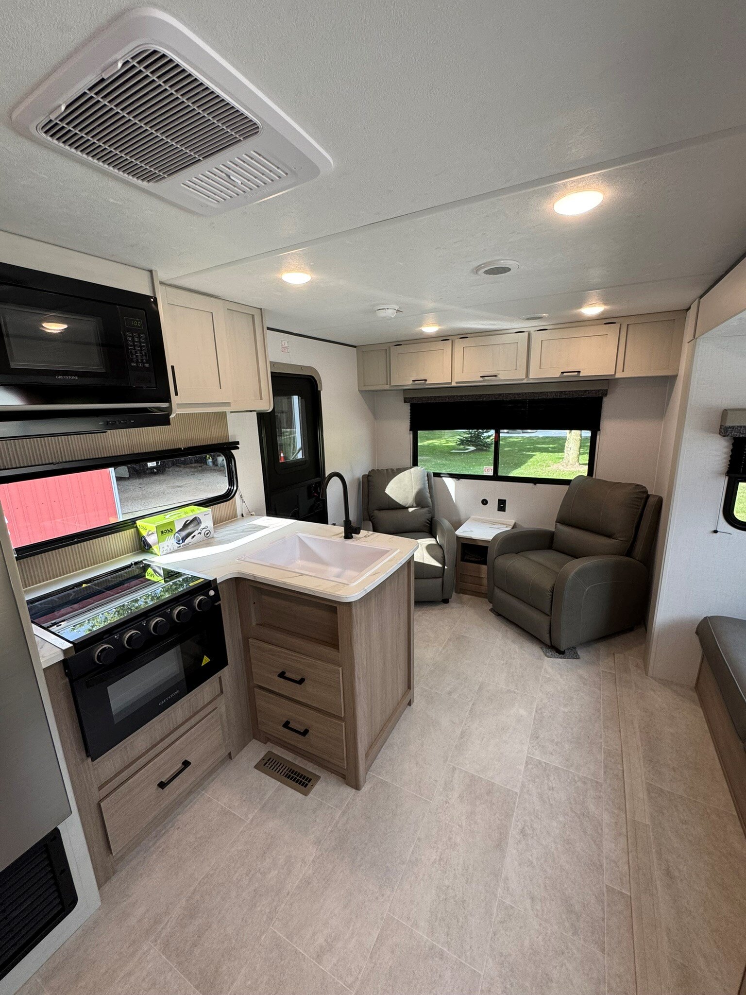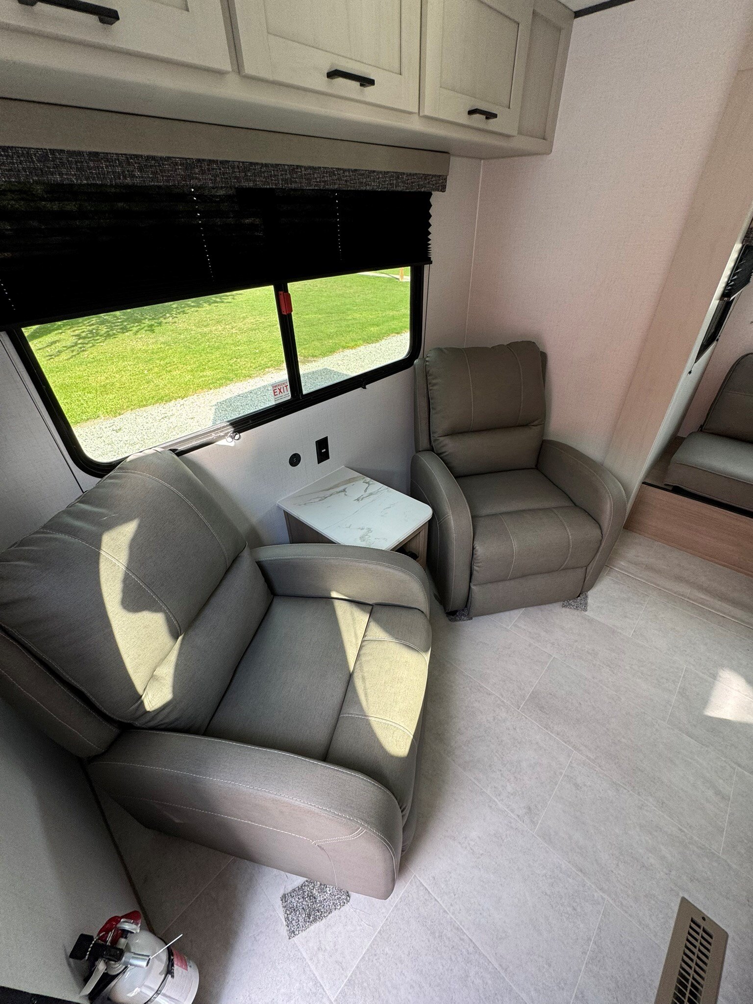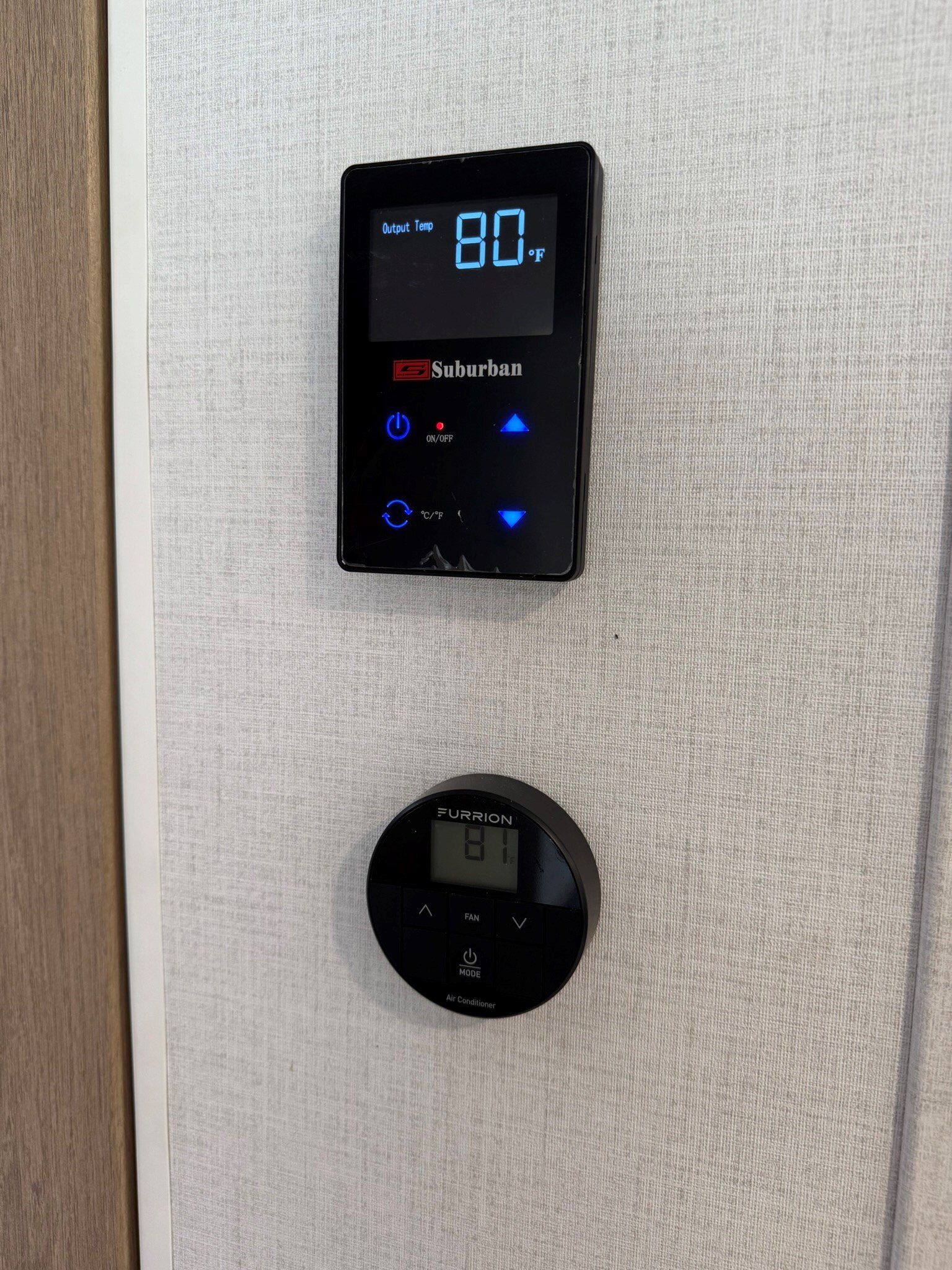 Dual entry doors, 1 slide with slide topper, Power front jack, power stabilizer jacks, hot water on demand, 2 propane tanks, furnace, fireplace, AC, power awning, led lights, 12V fridge, solar system installed and lots of storage!