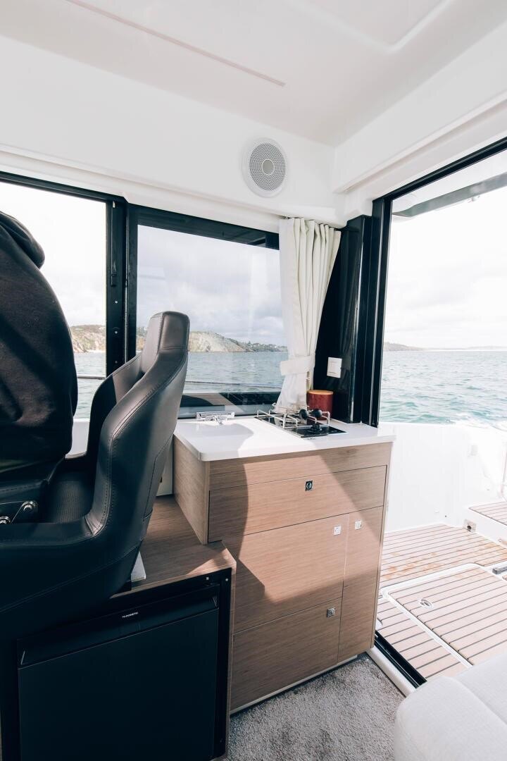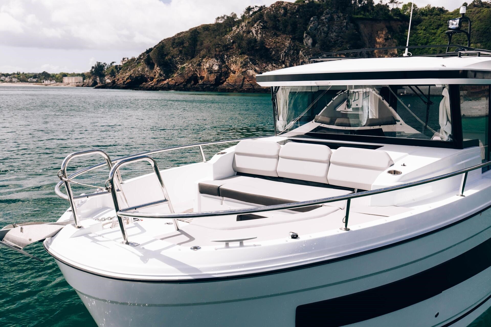 The Jeanneau 895 Sport is designed for those who want to experience the sea in sport mode: day trips, fishing, diving, kayaking, kite surfing… Priority has been given to vast, modular exterior spaces, boasting generous storage, a roof rack, secure handrails and wide and deep side decks to facilitate movement on board. The entirely open cockpit is superbly well-suited for fishing. Forward, an L-shaped cockpit serves as an exterior saloon, which converts into a sundeck for those who prefer to contemplate the sea or to sip a cold drink after the day's activity.