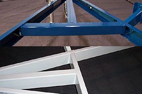 Tube construction offers a smoother finish and sleek profile. The painted surfaces yield an automotive quality finish. The electrical wiring and brake lines are enclosed for a more attractive appearance. The pivoting head bunk support system allows for hull conforming adjustability.