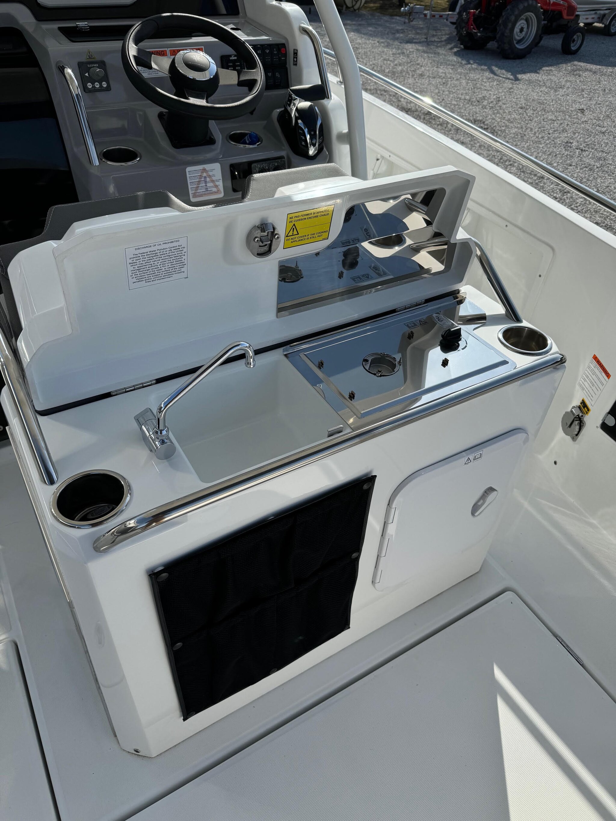 The Leader 7.5 CC Series 3 can accommodate up to eight people for outings, where all the on water activities are wide-open: fishing, water skiing, day trips, sunbathing, diving, swimming… While cruising, passengers can sit on the bench seating, forward of the helm station and facing the water, or choose the U-shaped cockpit for a cozier ride. Movement is fluid around the console between these two entertainment areas while cruising, but also at anchor, when the folding bench seating facilitates opens up the cockpit, giving access to the large storage lockers, and swim platforms.