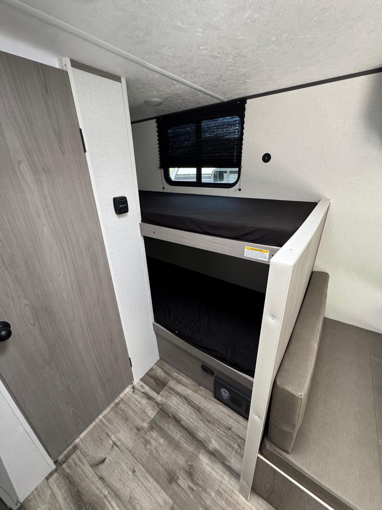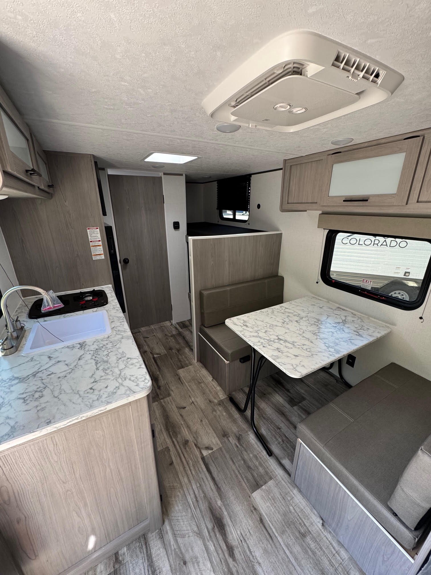 Great trailer for a small family. Sleeps two on the main bed, plus 2 in the bunks and 1-2 on the dinette table when folded down. 12V fridge, hot water on demand, 2 burner stove and more!