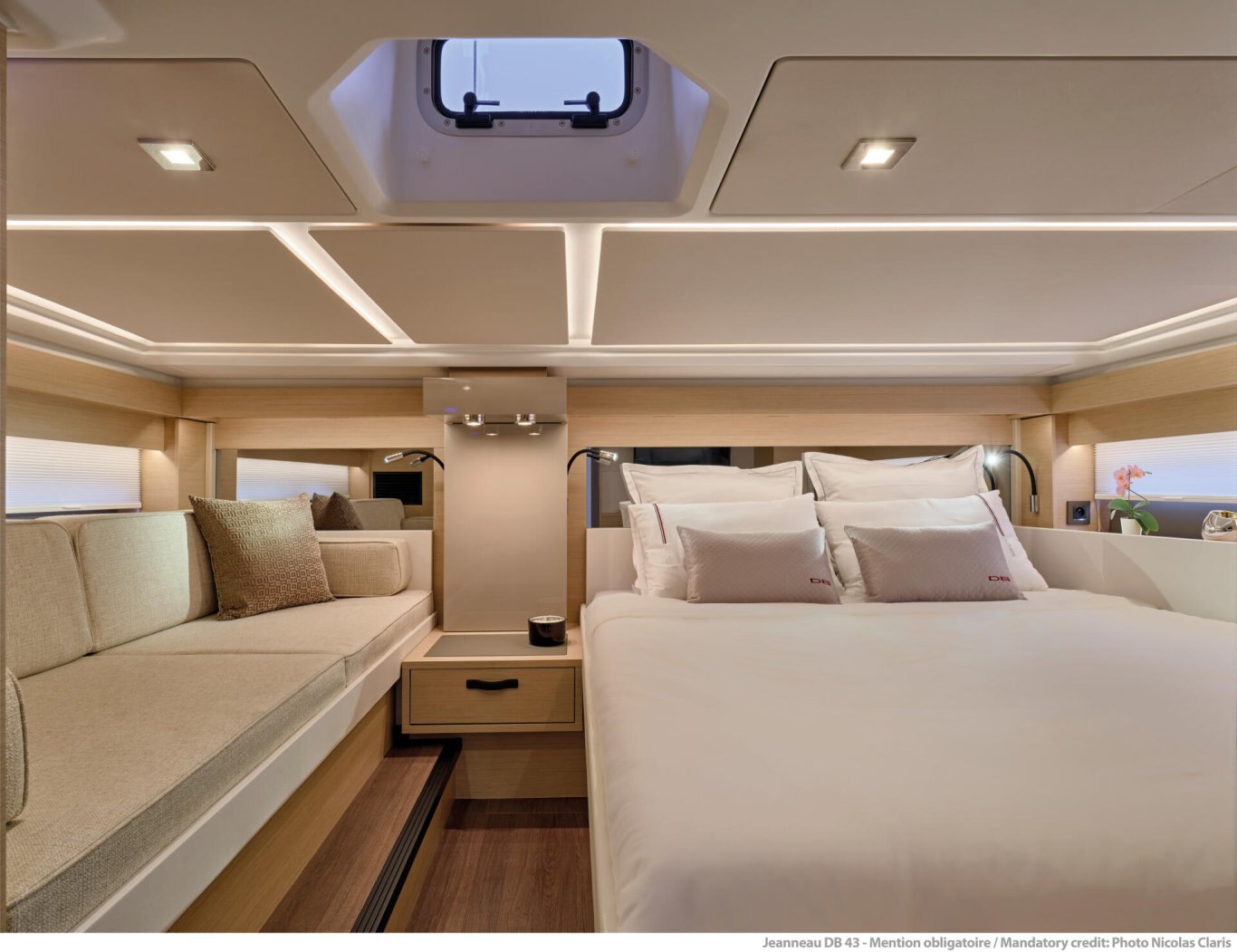 A Powerful, Luxurious, Distinguished Day BoatBoasting a strong outboard engine, the DB/43 OB offers sporty, responsive driving, with top speeds approaching 40 knots. Excellent performance is accompanied by remarkable seakeeping abilities and comfortable cruising, notably due to the hull by Michael Peters. A uniquely distinguished profile sets the tone for this boat, with a sparkling, contemporary design. Bathed in light, the spacious owner's cabin offers surprising levels of finish and comfort. Guests are accommodated in a superb full-beam cabin. |