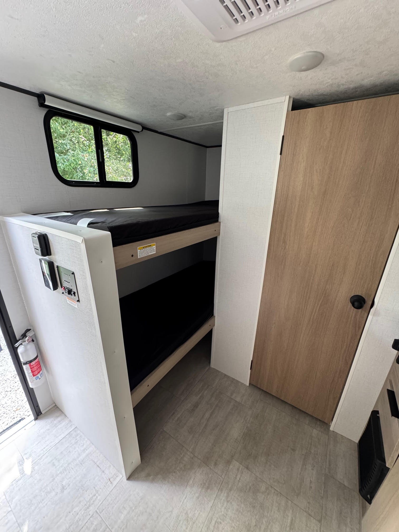 Fiberglass wall panels, roof mount AC, hot water on demand, furnace, 12V fridge, stabilizers and more!