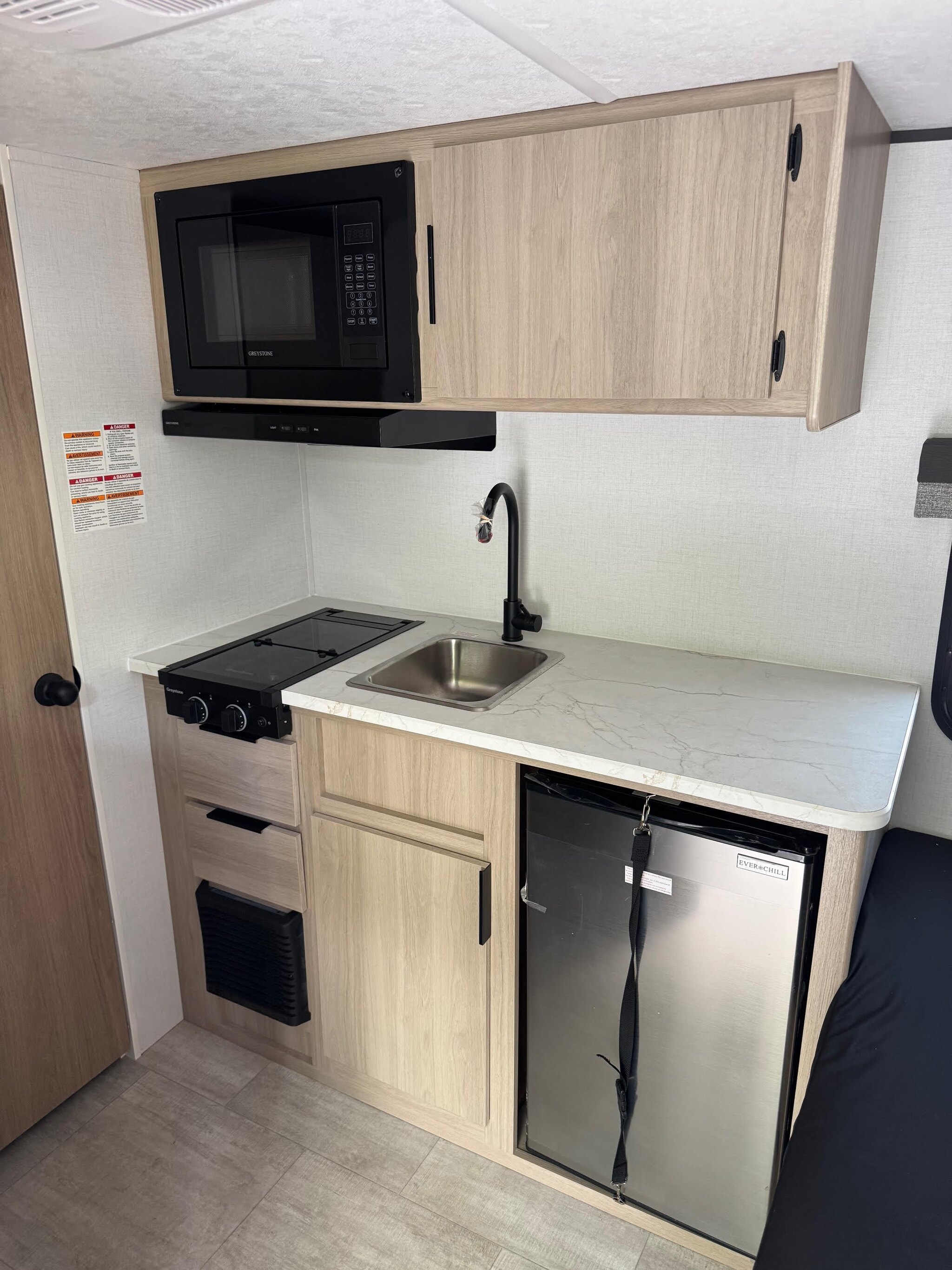 Who wants a tent or a pop up trailer when you can just tow this thing? A great size trailer to tow with an SUV or small pick up. Fiberglass wall panels, roof mount AC, hot water on demand, furnace, 12V fridge, stabilizers and more!